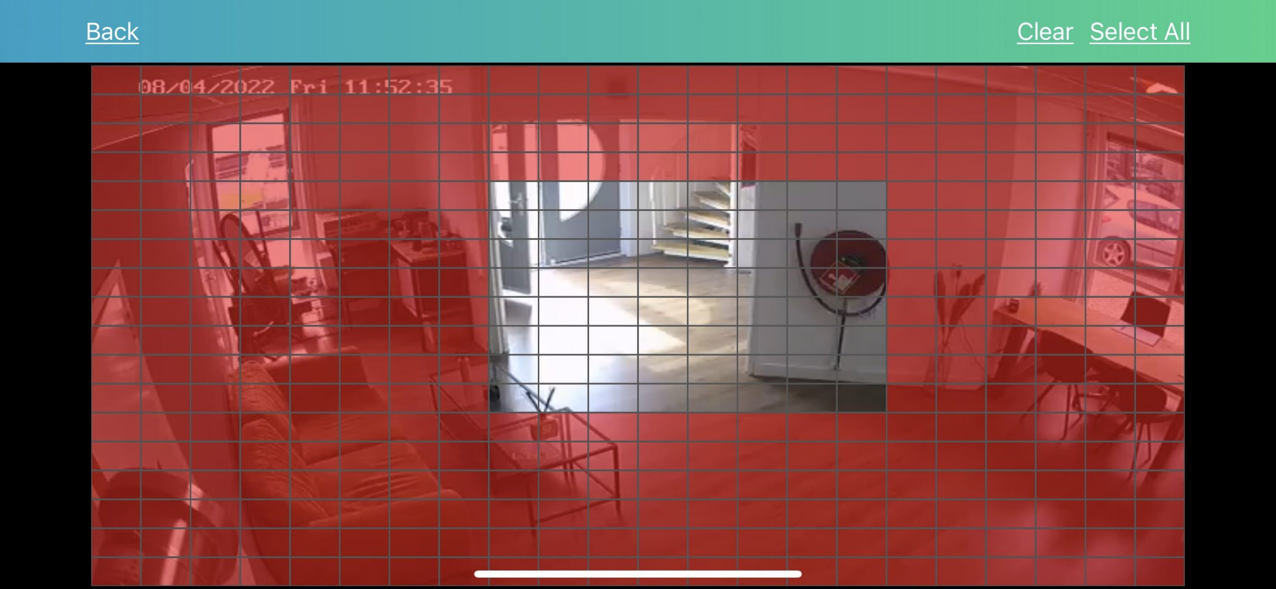 - U kunt hier een bewegingsgebied instellen. U kunt dit doen door uw vinger ingedrukt te houden en te verslepen over het beeld. Alles wat gemarkeerd is (rood) is ingesteld op het bewegingsgebied. Alles wat doorzichtig is, is uitgesloten.