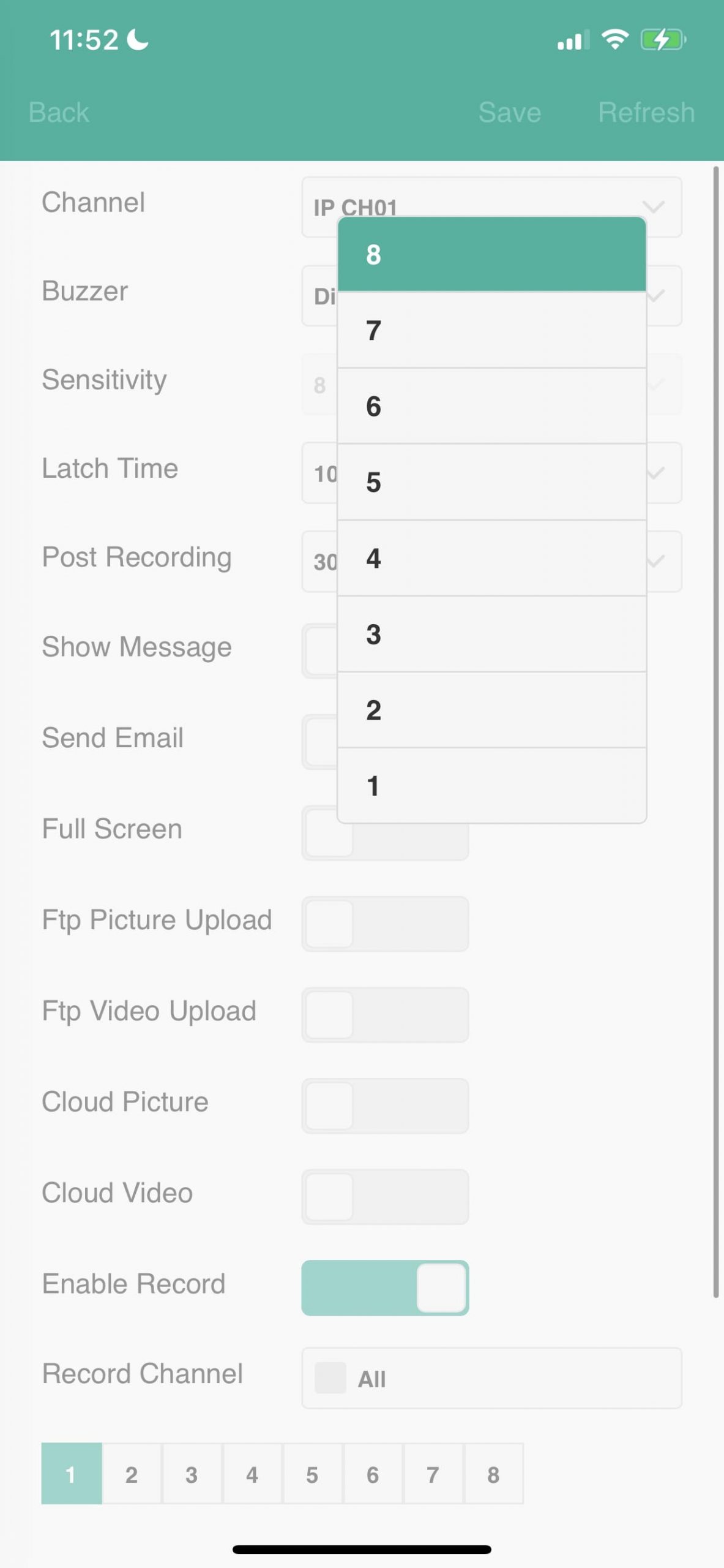 - Pas hier de: Sensitivity aan. 1 is lage gevoeligheid, 8 is hoge gevoeligheid.