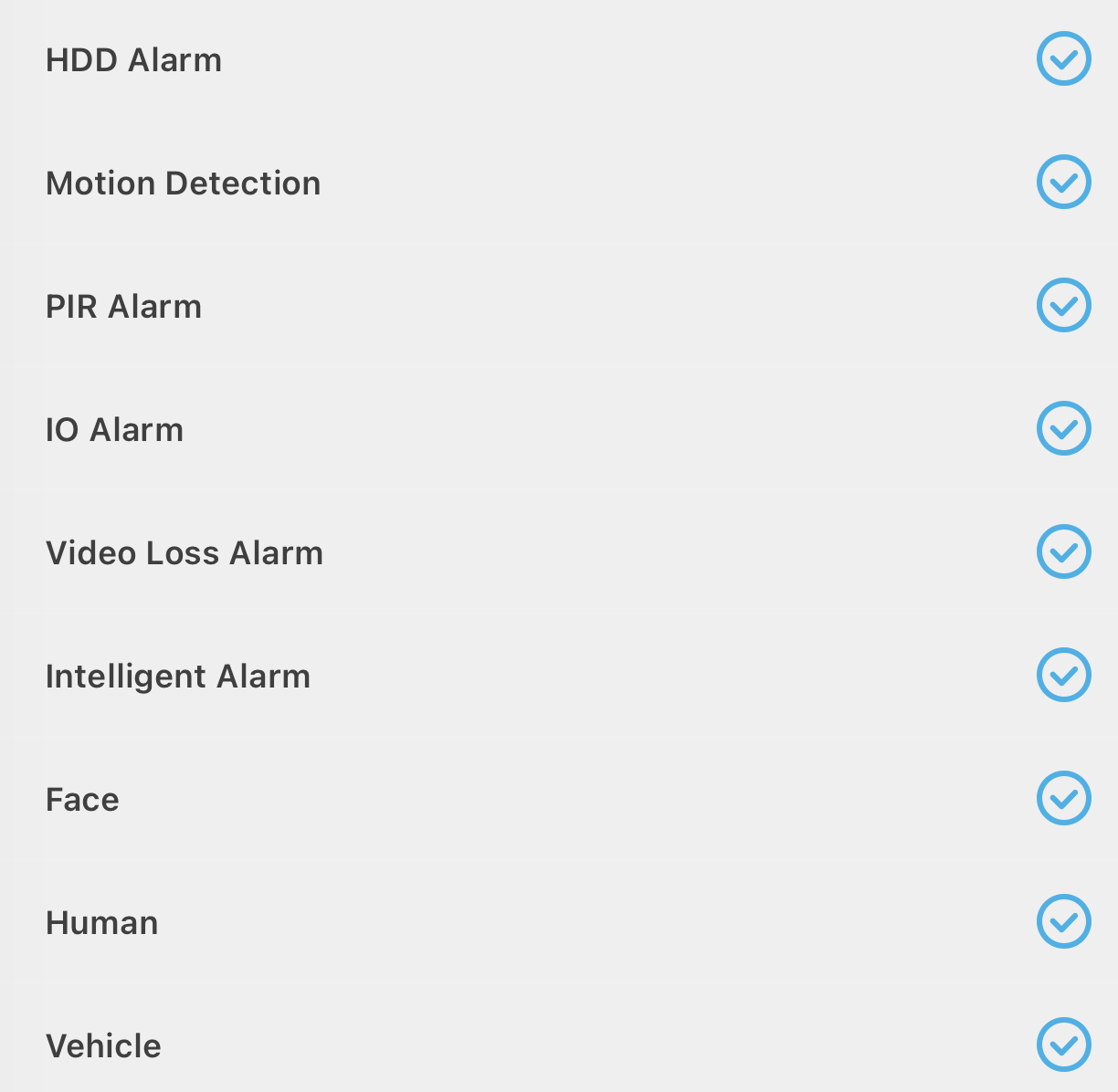 - Voor de camera’s die voertuigen- en personendetectie ondersteunen, raden wij aan enkel: Human & Vehicle, HDD alarm en Videoverlies in te schakelen.