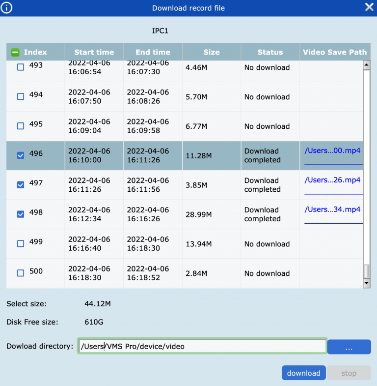 - Selecteer de gewenste bestanden/tijden en klik op download.